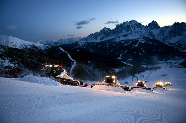 Lots of adrenaline and fascinating technical insights are offered to adventurous guests during the Free Fall Ride at the Croda Rossa when accompanying technicians on their nightly snow groomer tour. It takes them to one of the steepest runs in the Alps, the so-called “Holzriese”.