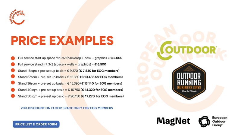 The link below opens an information pack with all details for European Outdoor Week 2026. Included is a useful tool with prices and available options for exhibition space at the Outdoor and ORBDAYS trade show.