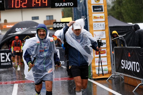 The atmosphere: Like at a mountain stage of the Tour de France – unfortunately in winter. After four days of baking heat, a cold front in the Alps caused a significant sudden drop in temperature. Whereas the participants of the 11th GORE-TEX® TRANSALPINE-RUN had to cope with temperatures of over 30 degrees Celsius in the beginning, the thermometer read only 6.5 degrees Celsius at the overcast summit station Alp Trida Sattel today. And together with the partially quite heavy constant rain these were not very pleasant conditions at all.