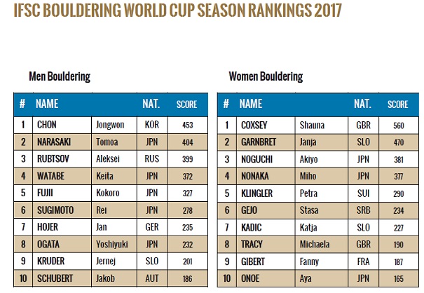 Japanese athletes competed exceptionally all season long and defended first place in the Bouldering team rankings with over twice as many points as the next country. Great Britain and Slovenia, also strong teams in 2017, placed second and third, respectively.