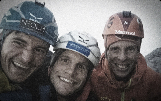 From the middle of the face further up Robert and Roger got support by the young Italian climber Simon Gietl. Robert describes: “Simon was like a breath of fresh air to us and we became a strong and fast moving team. Together we pushed forward our first ascend and in the same time we climbed all the pitches free in team redpoint style. For almost two months we were living in the shadowy cold Northface and took every chance we had! It was an ineffable moment when in the midst of fog and darkness, we reached the top. Our climb through this even for us incredible huge face, our Odyssey, found a good end!”