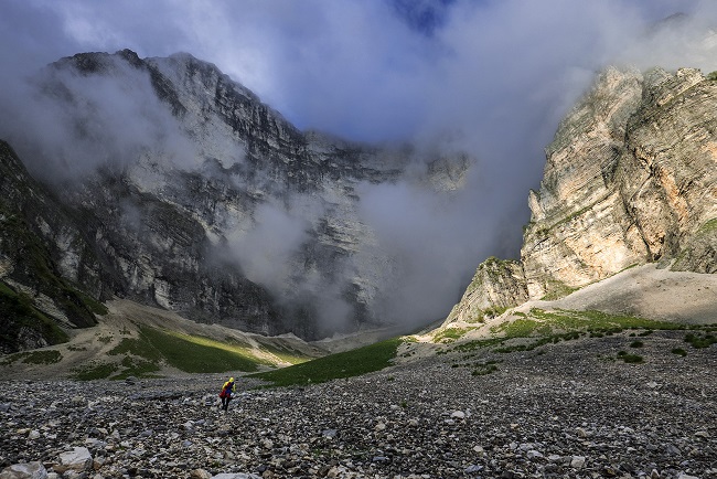 A few hours away Marko Prezelj (SLO) and Luka Krajnc (SLO), quest up the wild 700m limestone face of Papignut, attempting to link pitches of previously unexplored terrain, encased by fog and clouds, loose rock, and intermittent showers.