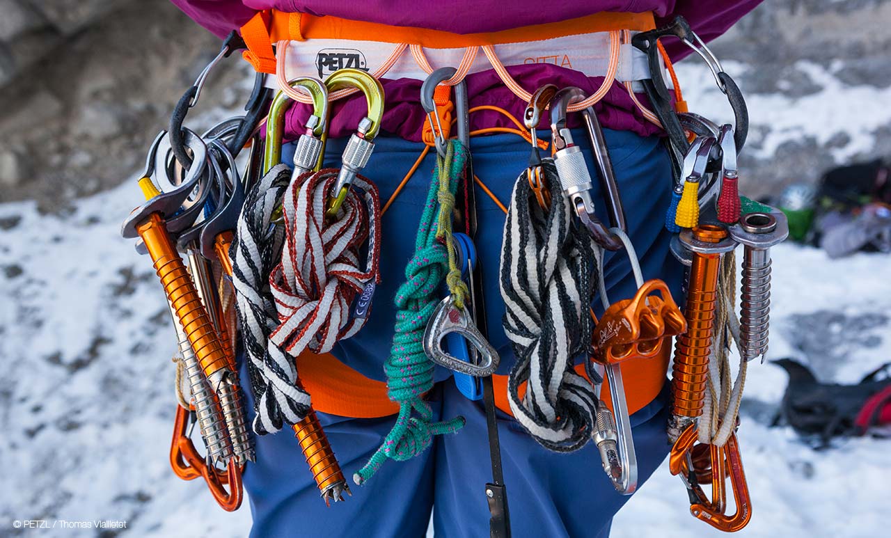 Always choose high-quality ice screws. Poor quality screws are difficult to place and put you at a greater risk if you need to place a screw quickly. You will need to carry at least 14 ice screws: 2 long screws for the lower anchor, 2 long screws for the upper anchor, and 10 screws of various lengths (5 L, 4 M, 1 S) per pitch. Ice screws need to be well-maintained and sharpened on a regular basis; one dull or damaged tooth makes it difficult or even impossible for the screw to engage. Specifically-designed holders make it easier to clip and unclip an ice screw from your harness.