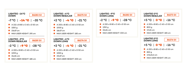 The Lightec Down is available in different versions, “regular” and “long”: Lightec -14°, Lightec -9°, Lightec -4°, Lightec 0°