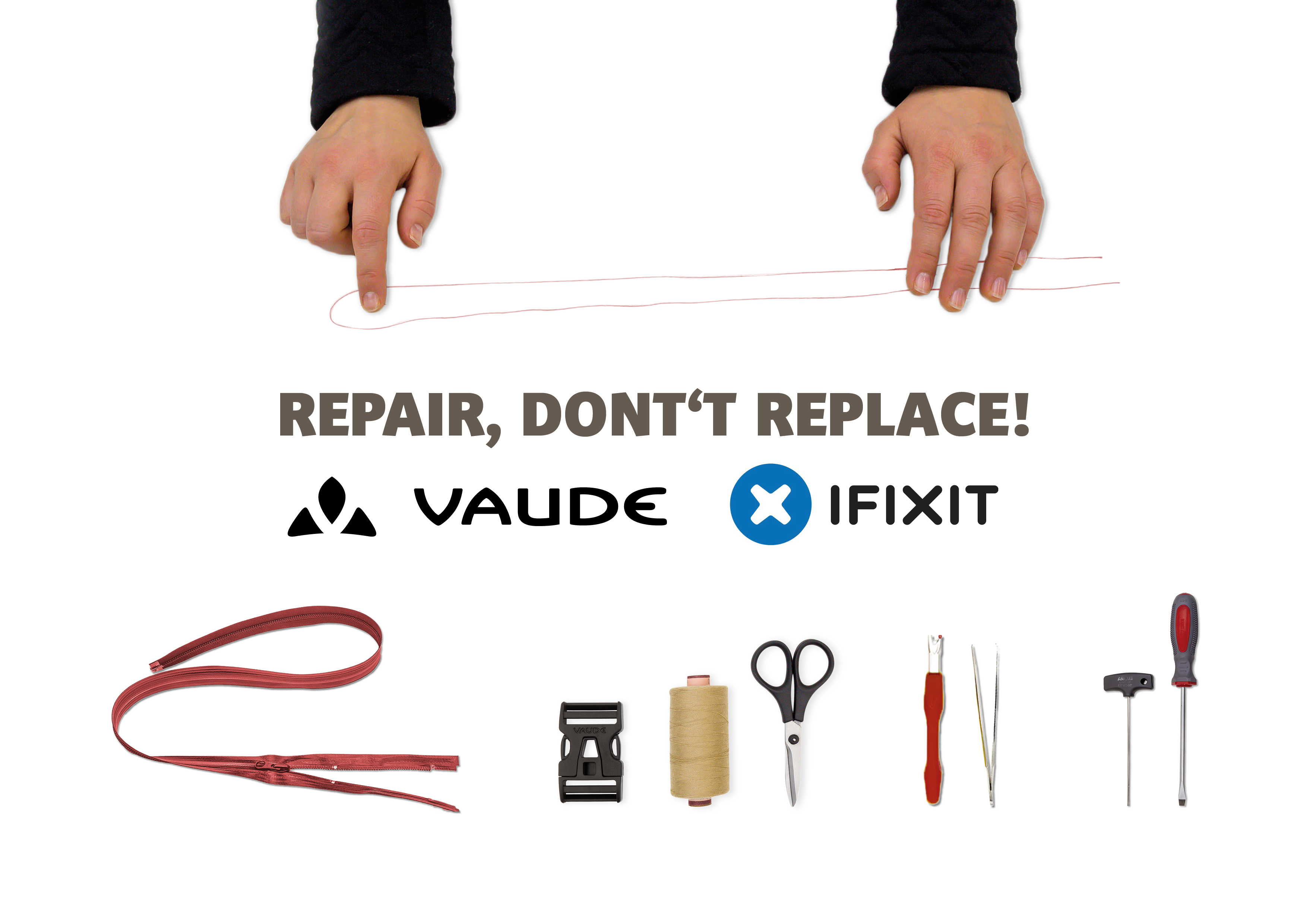 At VAUDE, sustainability is a common green theme that runs through the entire company. VAUDE products are manufactured with maximum environmentally friendliness and fairness. During the phases of material selection and processing technologies, a great deal of emphasis is placed on highest quality and product longevity. This means that early on – when a product is just being developed – it needs to be designed so that those parts subject to wear will be easily replaceable and any possible defects will be easily repairable. The longer a jacket or a tent stays in use, the better it is for the planet. The person using the product also has a significant influence on the longevity of a product. Good product maintenance is crucial, especially for high quality technical products. In order to retain their specialized properties, for example, during washing or follow-up waterproofing, one needs to know what to look for. Sometimes small repairs on parts that can wear out will also be needed to make a product functional long-term. VAUDE supports its customers in making these repairs themselves with the iFixit platform. “Ideally, manufacturers should already be thinking about the repairability of their products during the design stage and promoting this by providing repair manuals and spare parts. VAUDE is one of those producers, which is why we at iFixit are very pleased about this collaboration,” said Matthias Mayer, Managing Director of iFixit Europe